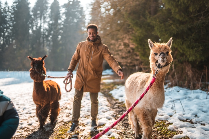 Nach dem blumigen Start geht es raus in die Natur. Eine Alpaka-Wanderung bei Millers Landleben zählt zweifellos zu den außergewöhnlichsten Erlebnissen der Region. Die klare Winterluft und die sanften Hügel bilden dabei die perfekte Kulisse für eine entspannte Zeit zu zweit.